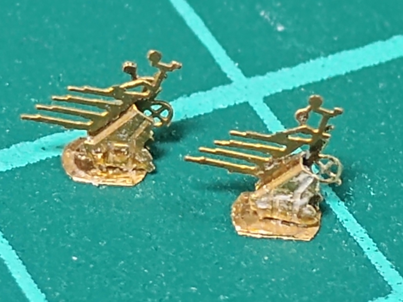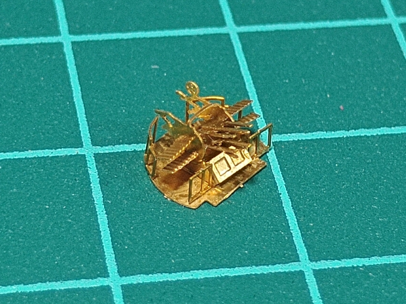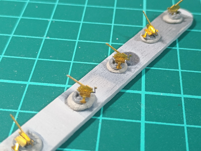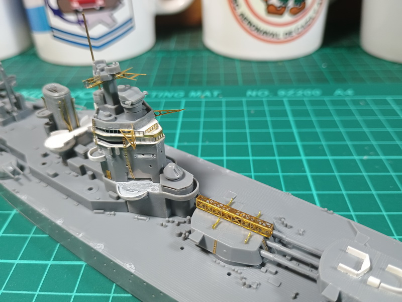 After completing the initial modifications to the bridge, I moved forward with the structural work. The most significant challenge was scratch-building the platform for the octuple Pom-Pom anti-aircraft guns. Located forward of the funnel, I fabricated it using high-impact polystyrene and foam board. Additionally, I replaced the funnel piping with brass rods for a more realistic finish. Finally, before starting the photo-etched (PE) detailing, I constructed the shields for the aft AA guns.