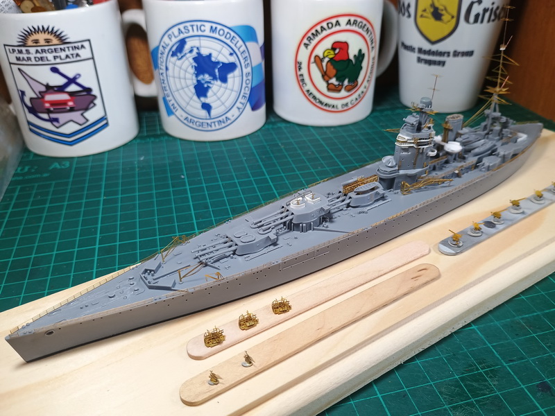 Para el detallado, utilicé el set de WEM (White Ensign Models). Como es habitual en la marca, la calidad es excelente; aunque piezas como la estrella del mástil o los montajes Pom-Pom exigen paciencia, el resto del conjunto se trabaja con facilidad. En cuanto a los cañones cuádruples Vickers de las bandas del puente, recurrí al 'cajón de sastre' utilizando sobrantes del set para destructores británicos, también de WEM, que empleé en el ARA Buenos Aires. Con las reformas y el detallado concluidos, el modelo está listo para la fase de pintura